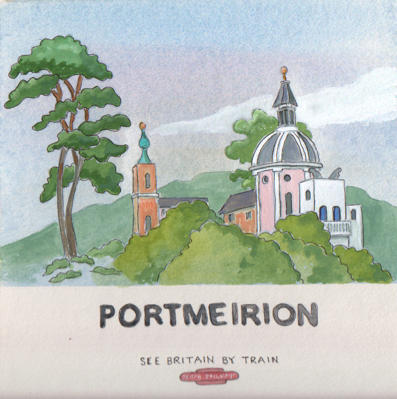 I combined some sketches, made some 30 years previously, when we visited the Italianate-styled village of Portmeirion in North Wales. I laid down a watercolour wash for the entire background of the image, overlaying my drawing and using gouache to complete the scene.